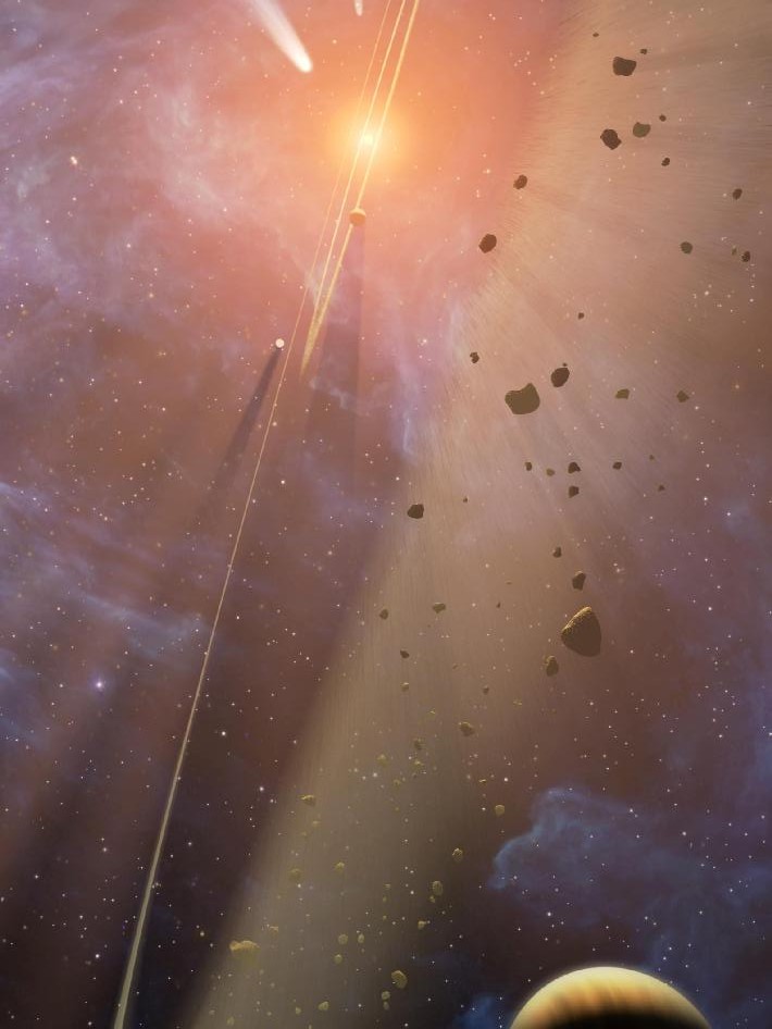 This artist’s conception shows the closest known planetary system to our own, called Epsilon Eridani. Observations from NASA’s Spitzer Space Telescope show that the system hosts two asteroid belts, in addition to previously identified candidate planets and an outer comet ring. (Image courtesy NASA/JPL-Caltech)