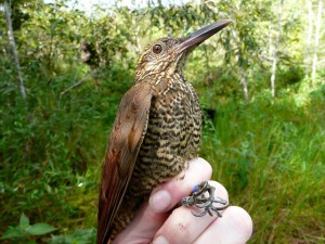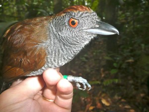Image left: The White-plumed Antbird has gone “extinct,” then returned, several times in the forest. Click to enlarge. (All photos by Phillip Stouffer/LSU)