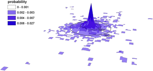 This spatially explicit map of the probability of see dispersal away from feeding trees by toucans shows seeds have a 56-percent chance of being dispersed more than 328 feet (100 meters) and an 18-percent chance of being moved more than 656 feet (200 meters).