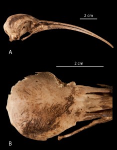 Image left: Skull (top) and (below) detail of feathers adhering to the cranium of Apteribis sp. from Lanai, Hawaii Islands (Photo courtesy Carla Dove)