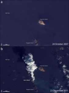 Image right: This NASA satellite image, acquired Jan. 7, 2012, shows the recent eruption in the Red Sea that has risen completely above water. Click image to enlarge.