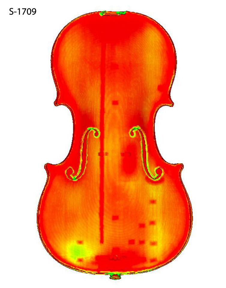 Image right: A color-enhanced image from a CT scan of a violin from the collection of the National Museum of American History that reveals the thickness of the wood of the violin’s front as well as past repairs.