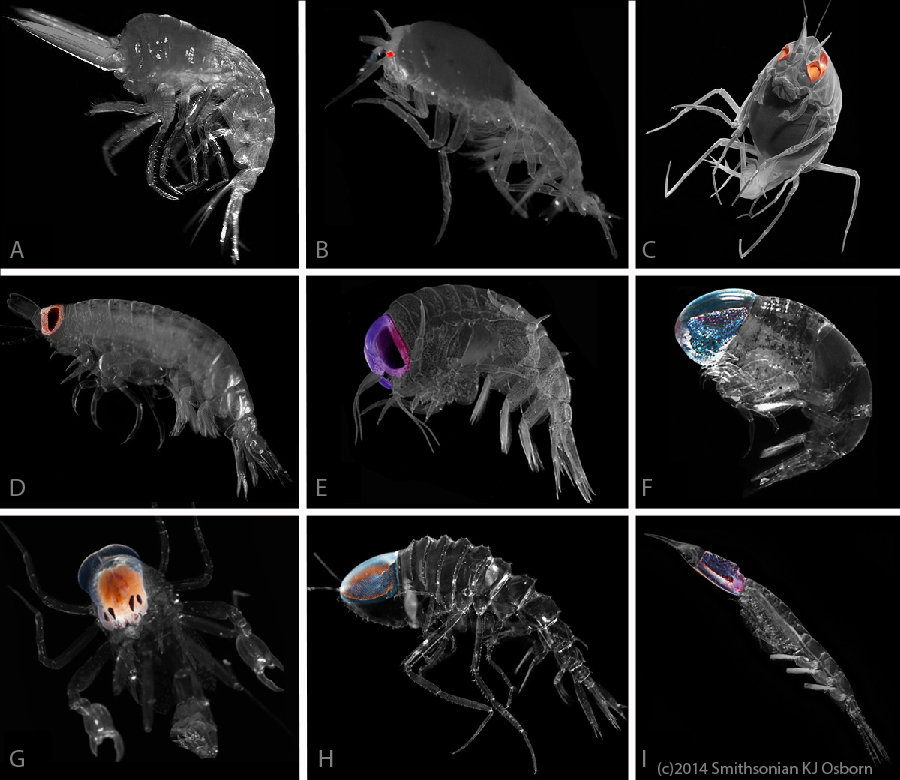 Various hyperiid amphipods with bodies grayed out and eyes in color. A) absent eyes, “Mimonectes”; B) simple eyes, “Lanceola”; C) mirrored pigment cups, “Scypholanceola”; D) single pair of eyes with crystalline optics, “Vibilia”; E) single pair of eyes with crystalline optics and light guides, “Hyperia”; F. single pair of eyes with upward- and sideways looking portions, “Pronoe”; G) two pairs of eyes, “Phronima”; H) one pair of eyes with thin, diffuse retina sheet, “Cystisoma”; and I) a single, cylindrical eye, “Leptocotis”.